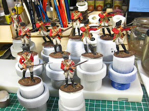 These figures are from a classic "A Call To Arms" , British Grenadiers set from the American War Of Independence series. This set is consisted of 4 different poses painted here , some of them X4 .Two more figures added but I couldn't identify maker. These are the two reloading guys in the back.